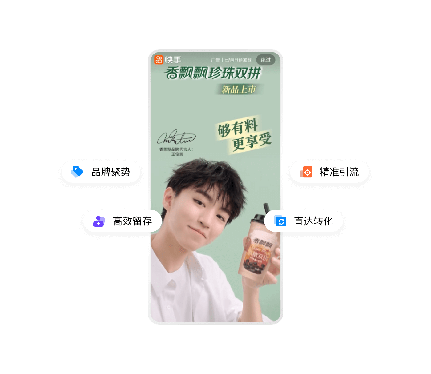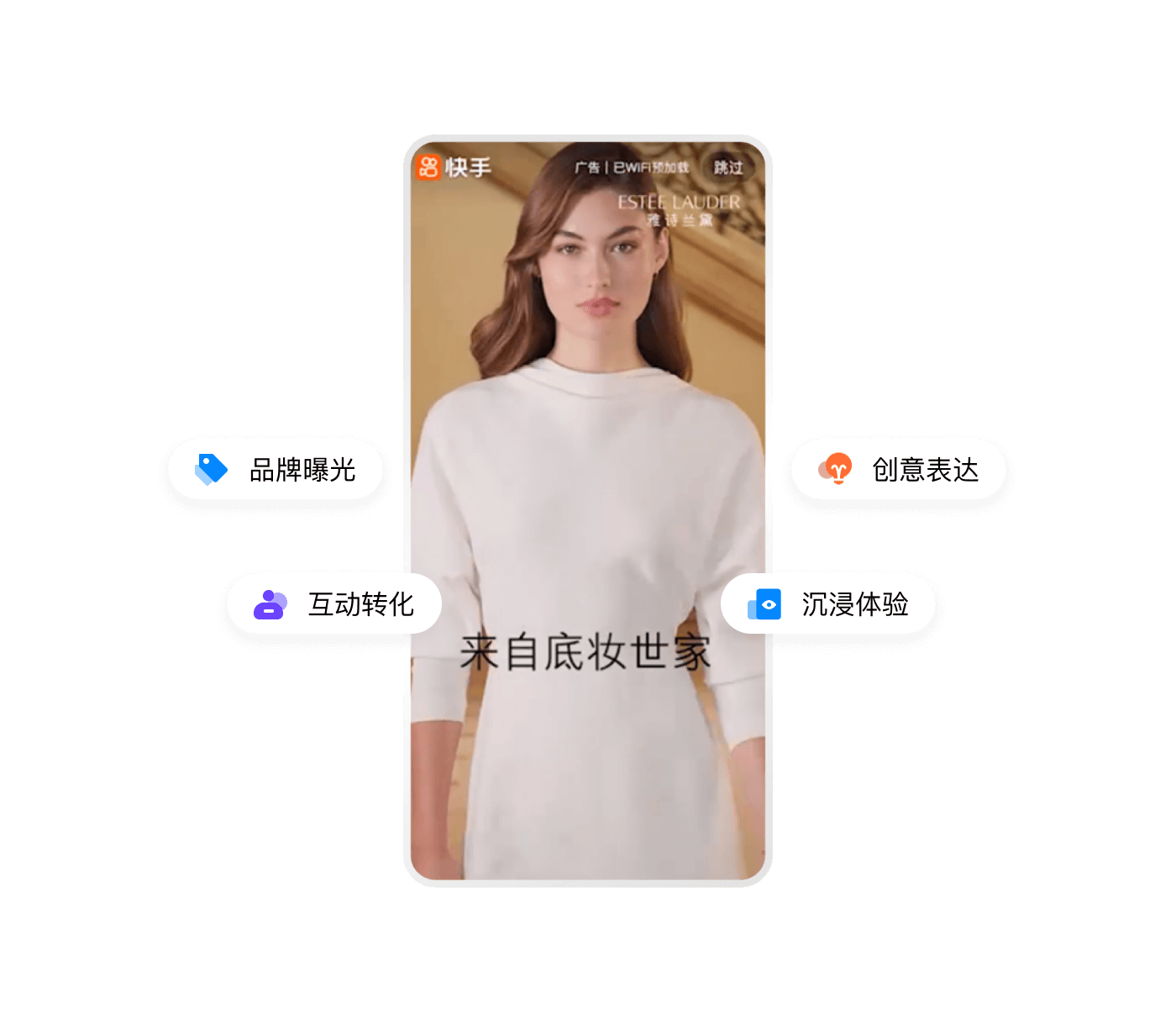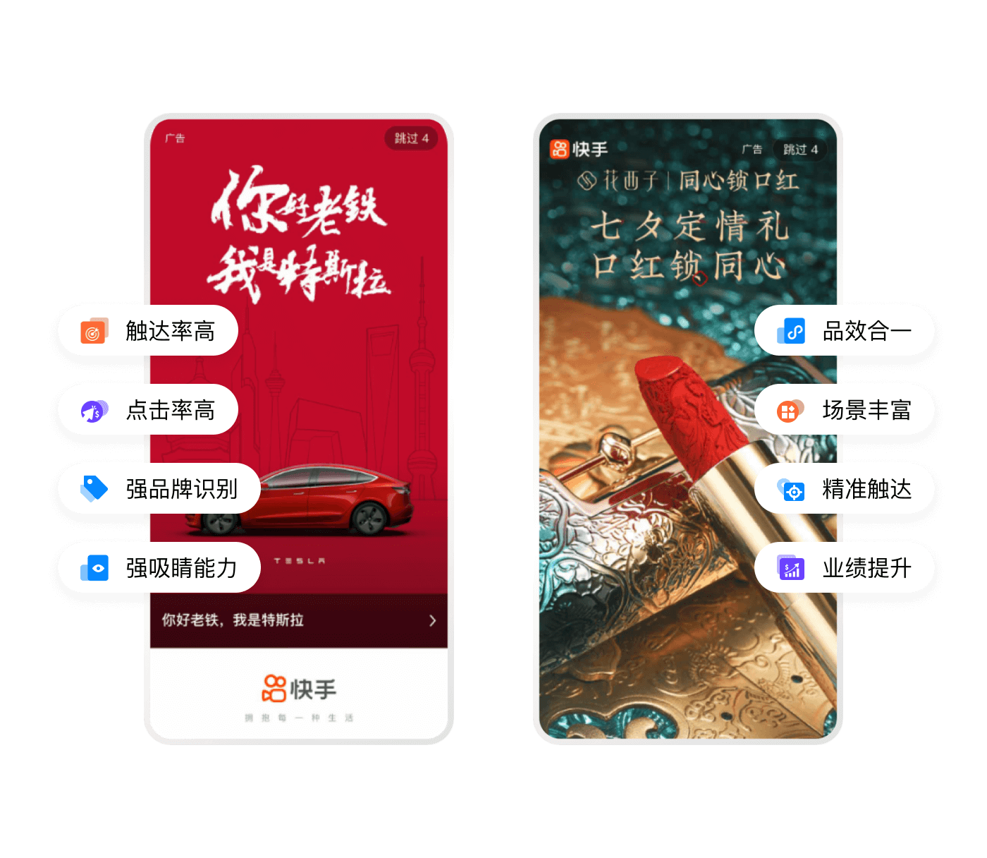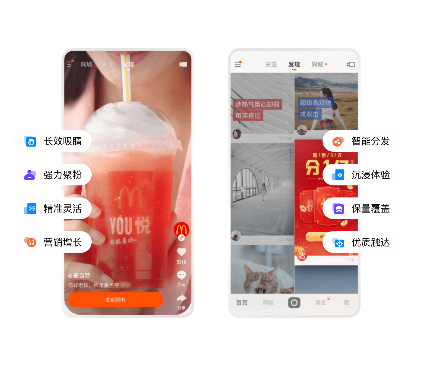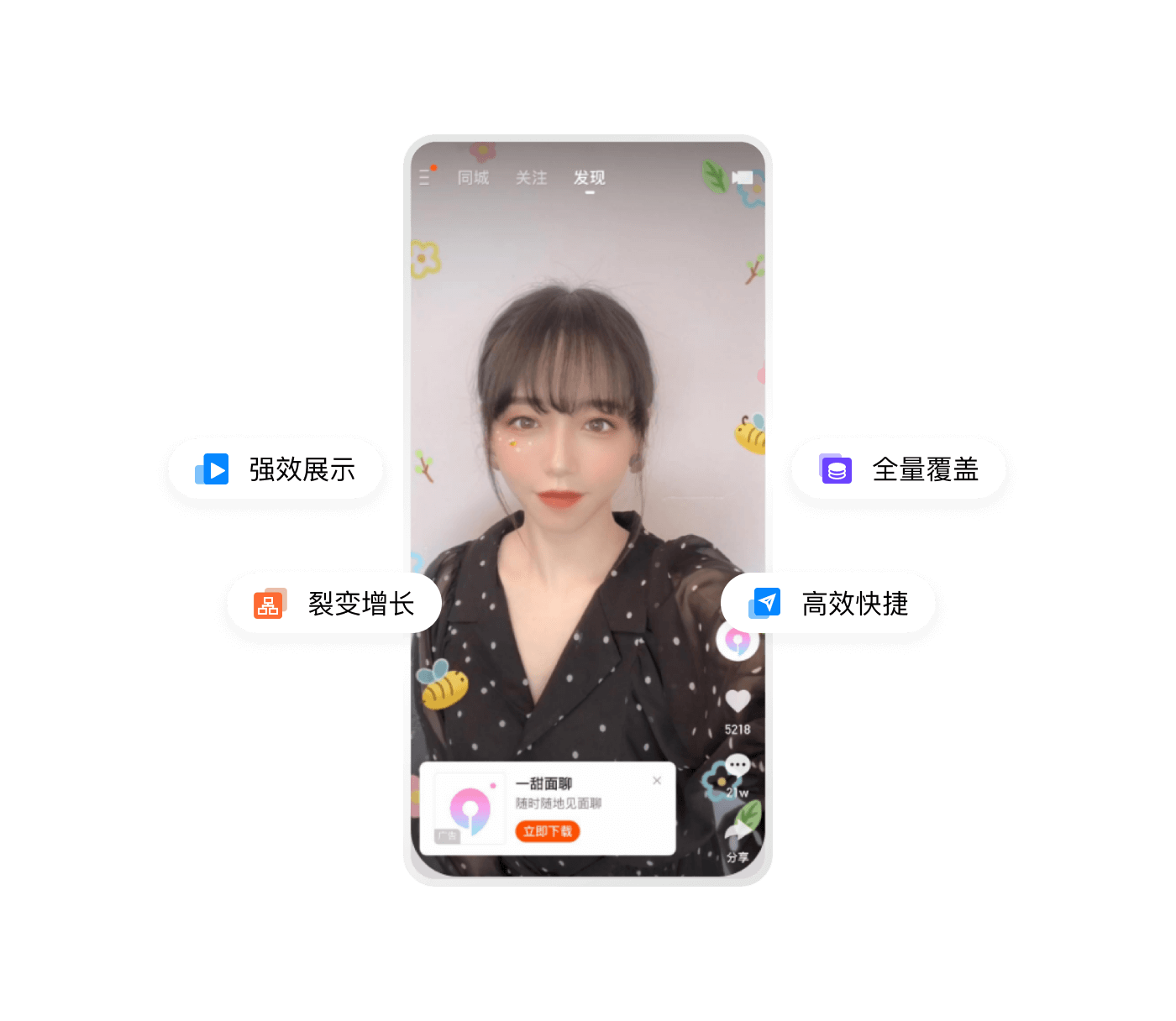 原生視頻內容展現,基于社交沉淀驅動(dòng)用戶(hù)裂變轉化,快手后 臺一站式操作,投放高效便捷